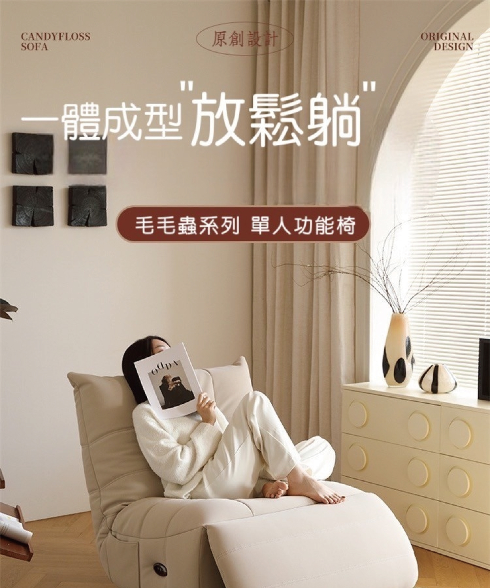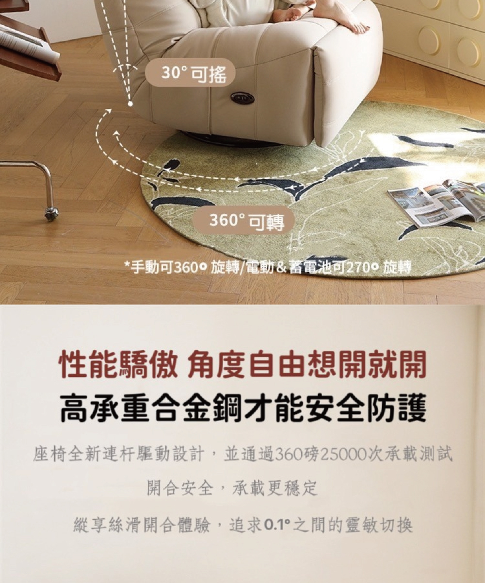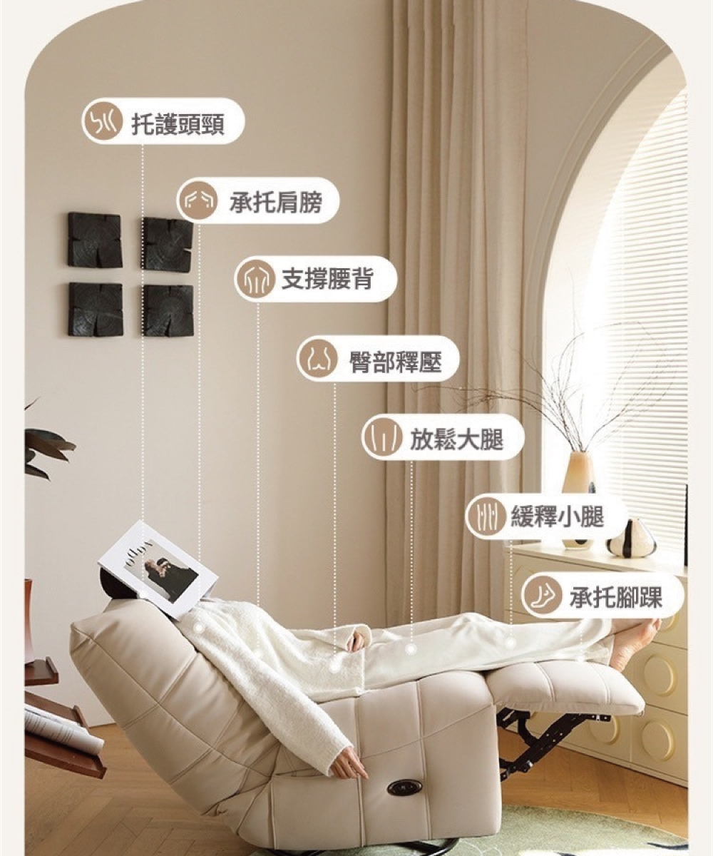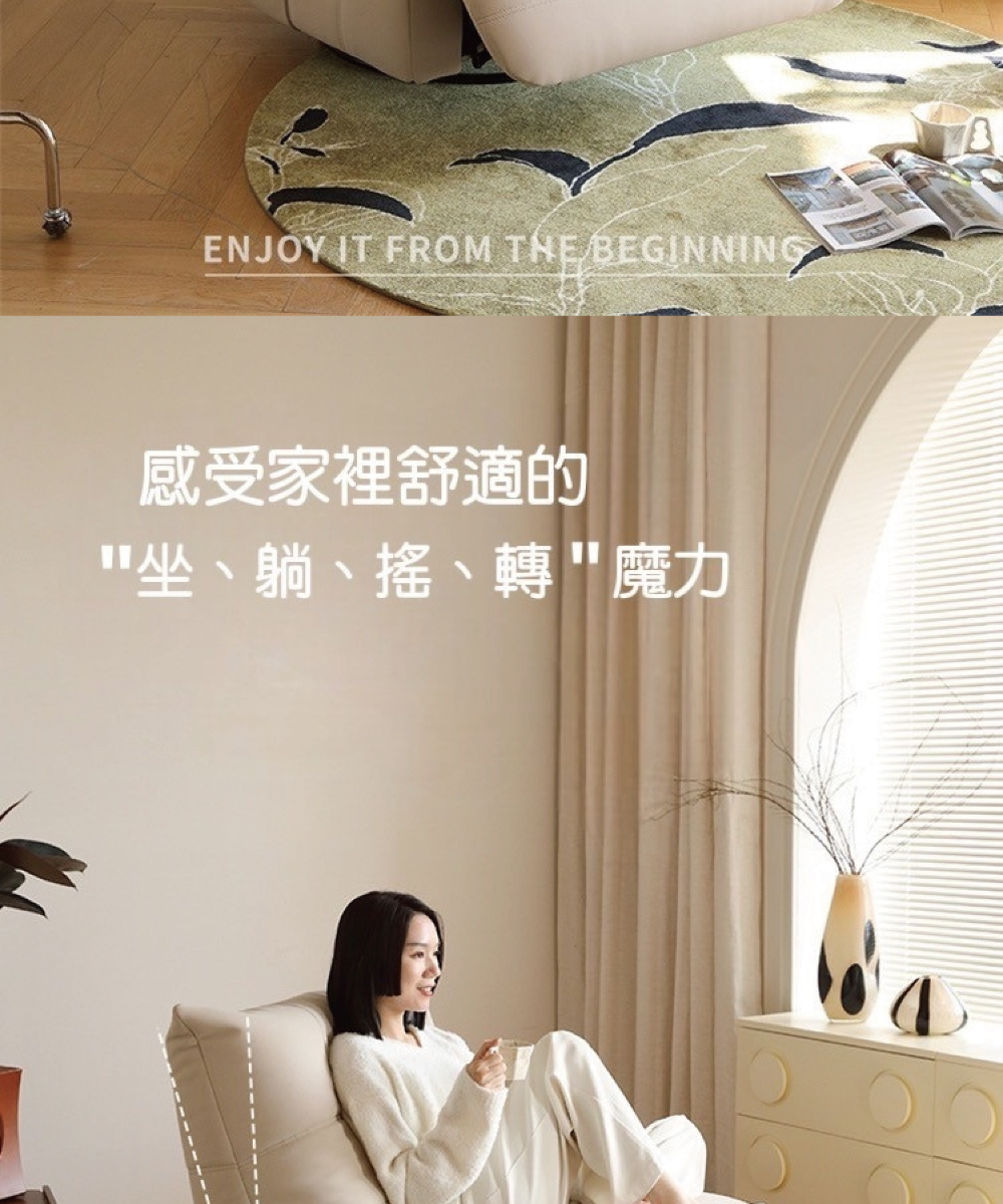 1.四合一功能:坐、躺、搖、轉,一張椅子滿足所有放鬆姿勢。