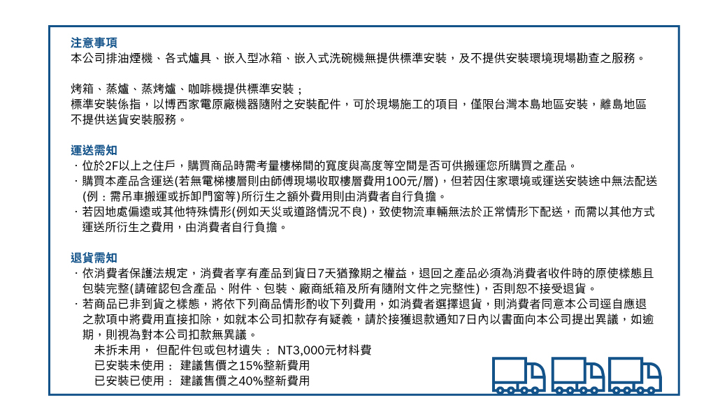 · 訂單成立後,一天內〈不含國定假日、例假日〉將會有專人聯繫確認訂單資訊,請務必保持電話暢通,若無法聯繫將無法安排出貨,則影響配送時間。需安裝之商品,安裝人員會再與您連絡約定安裝時間,實際時間以安裝人員電聯約定時間為準。