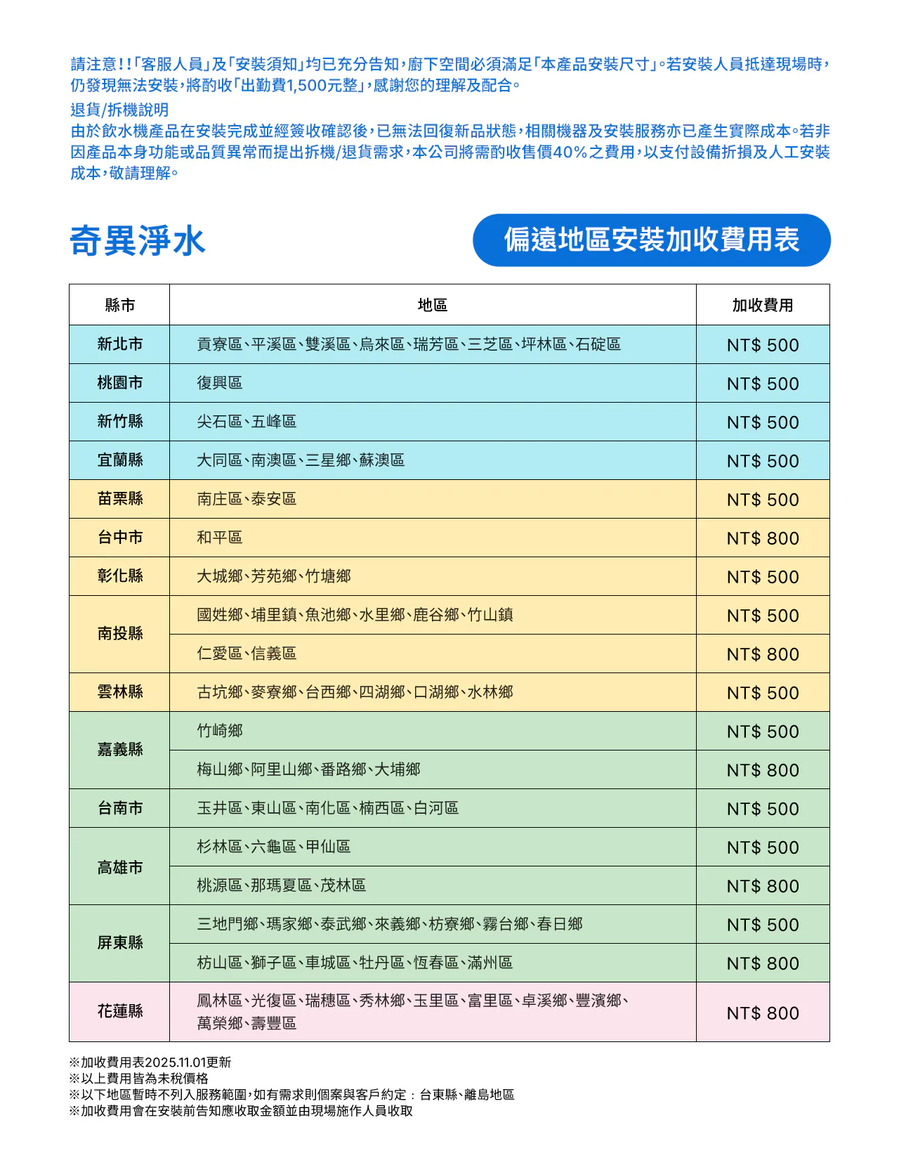 · 基本安裝服務範圍以原廠商品箱內所附之零件材料安裝,由若超出基本安裝範圍,安裝人員依實際狀況現場報價,並於施工完成後直接收取